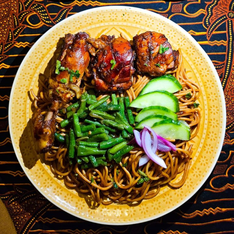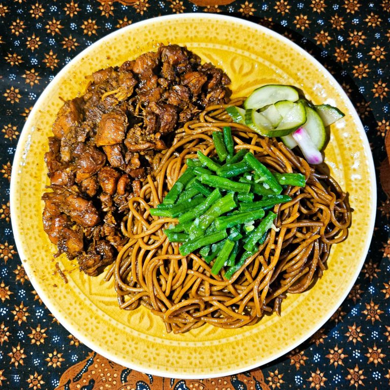 Javaans-Surinaamse bami met gemarineerde kippenbout, kouseband, atjar en huisgemaakte sambal